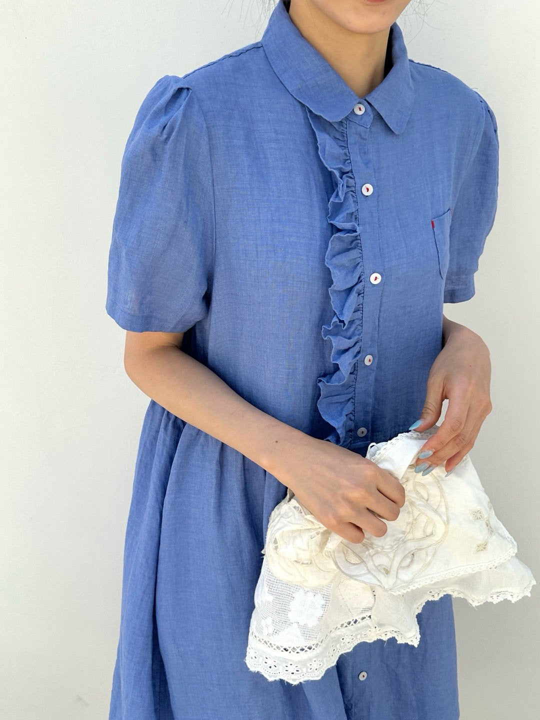 • Feminine round collar with delicate shoulder puff accents