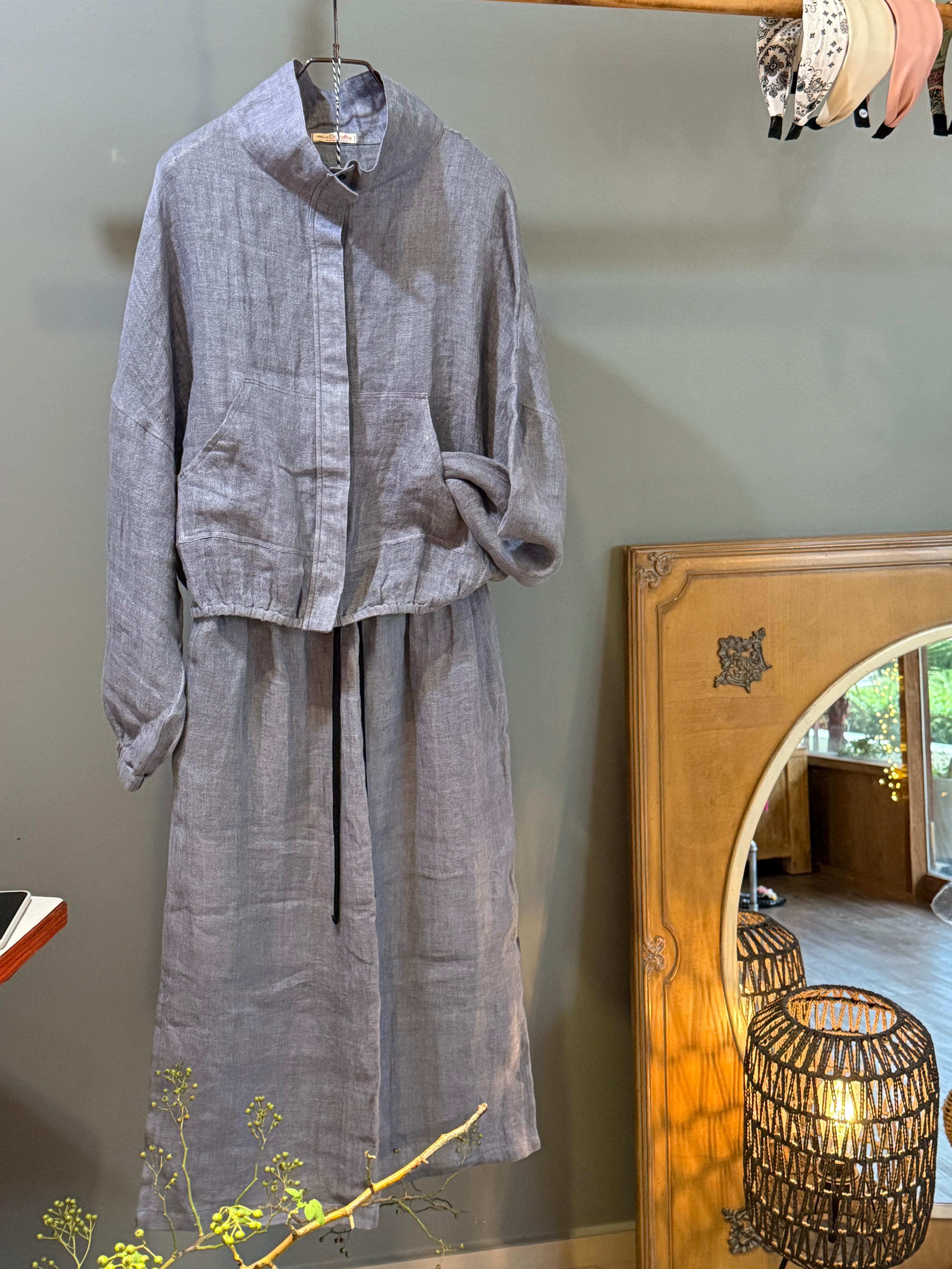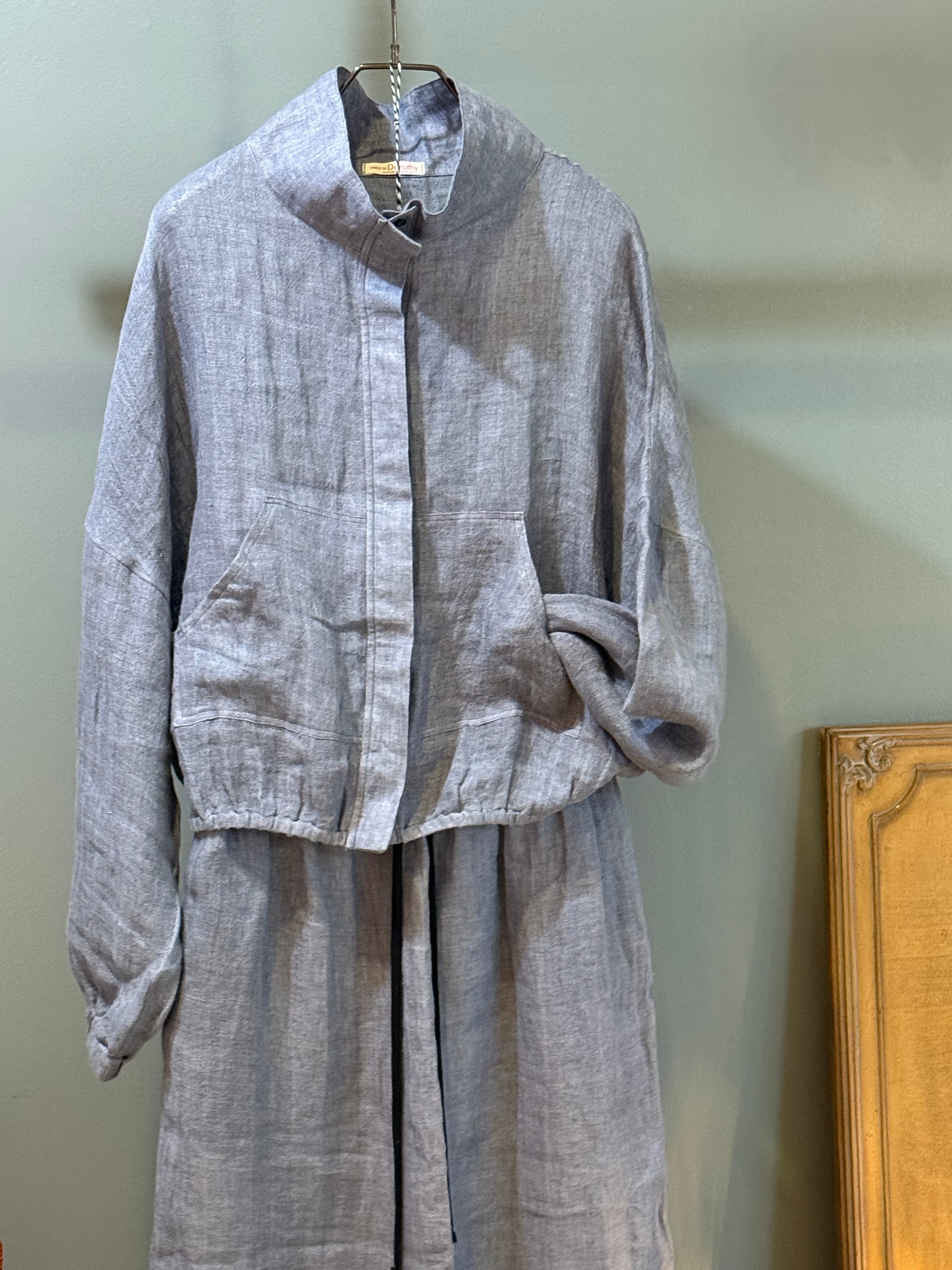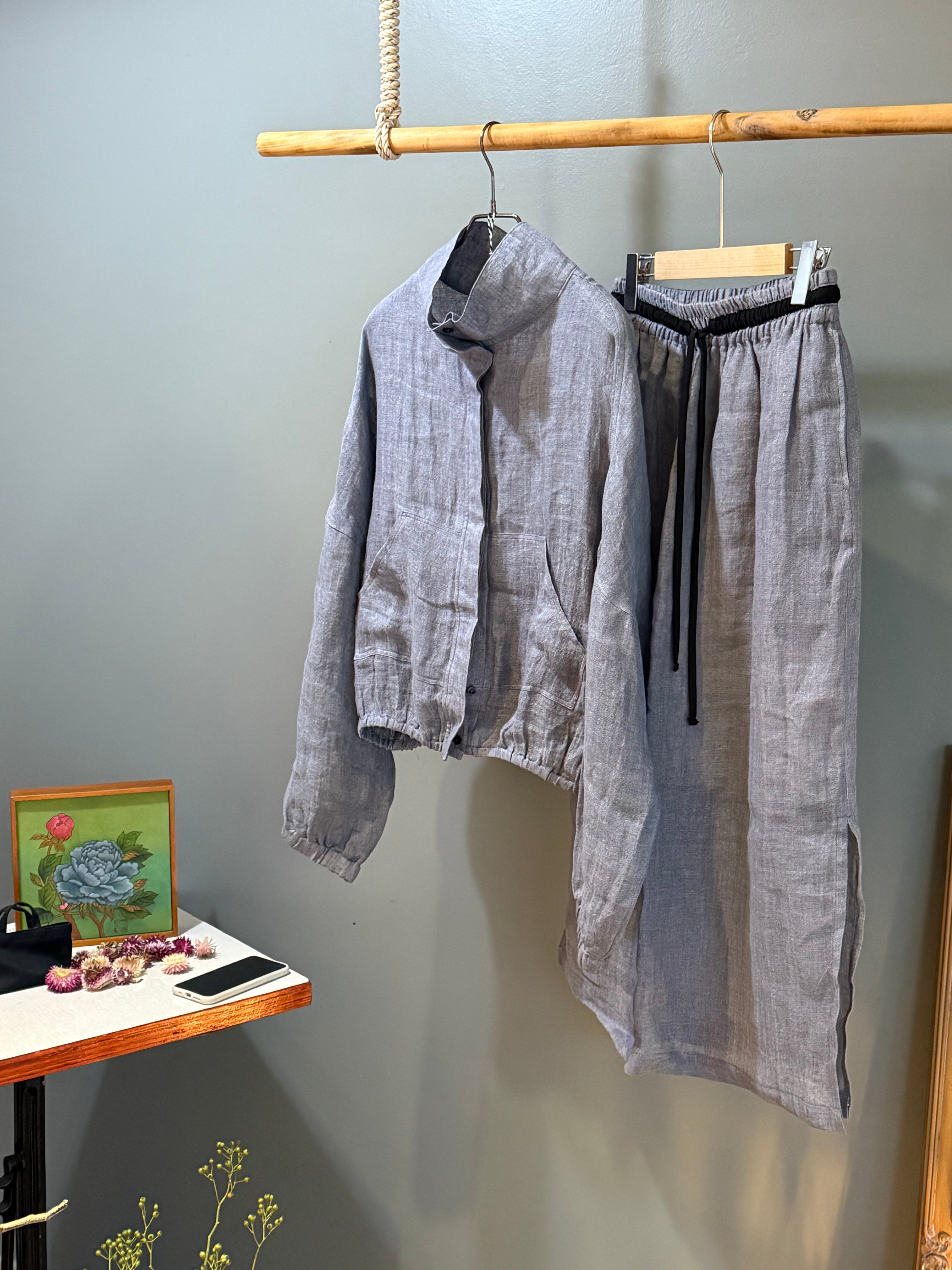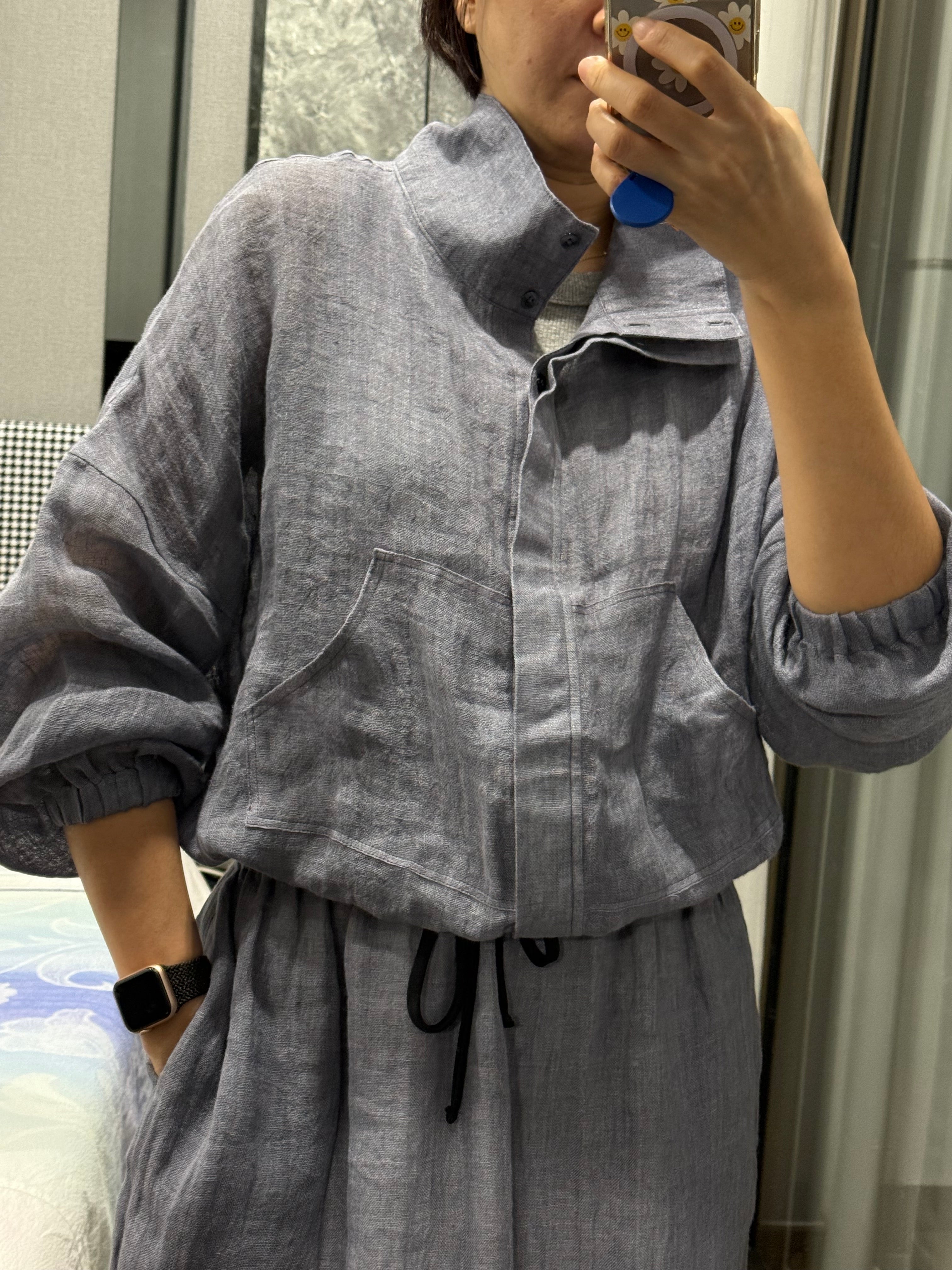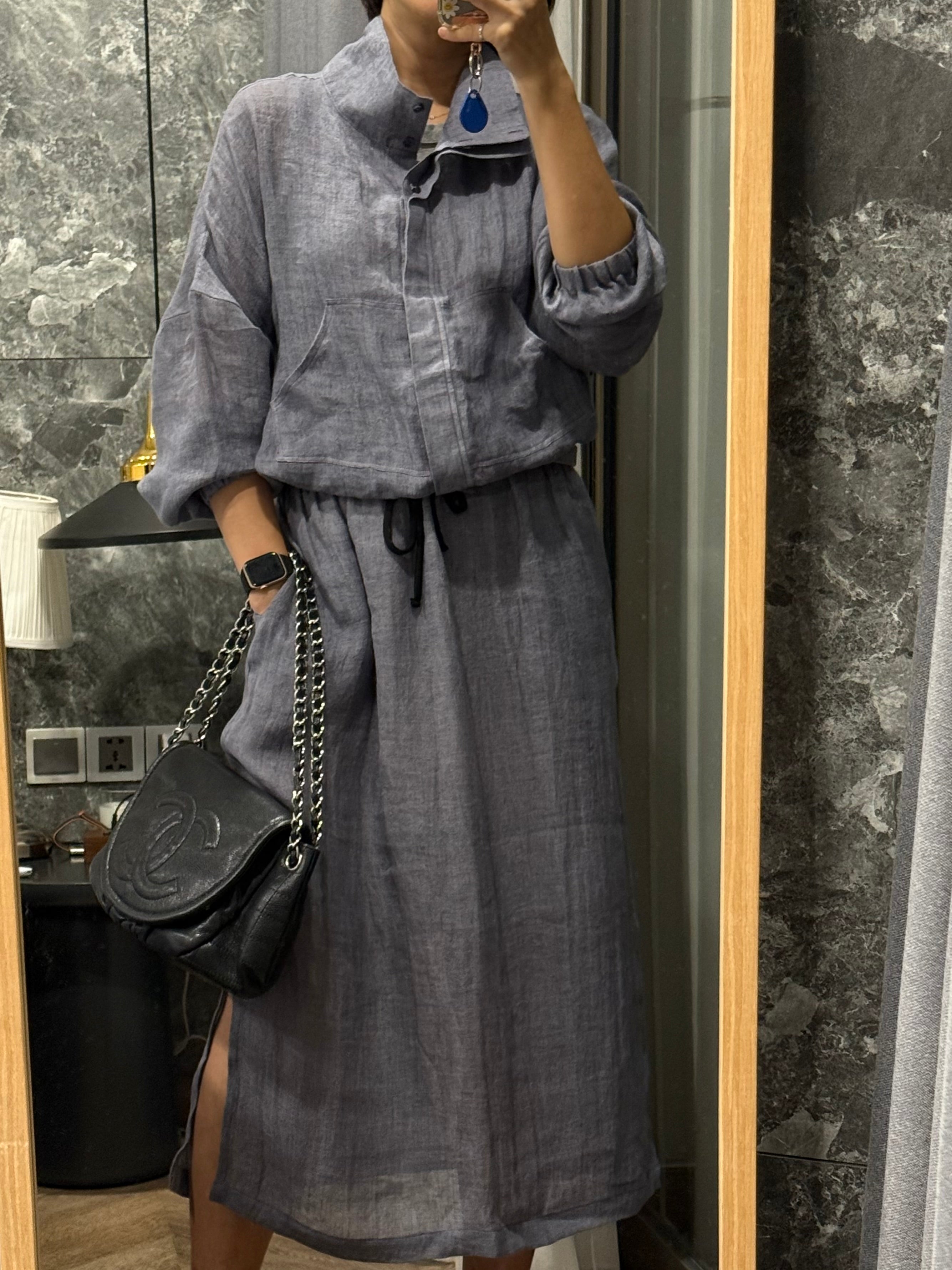 High collar pure linen skirt and jacket set