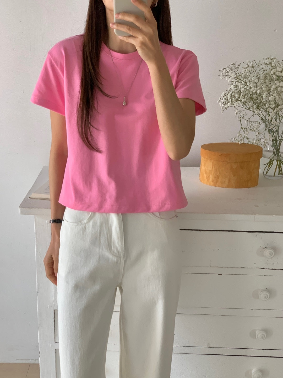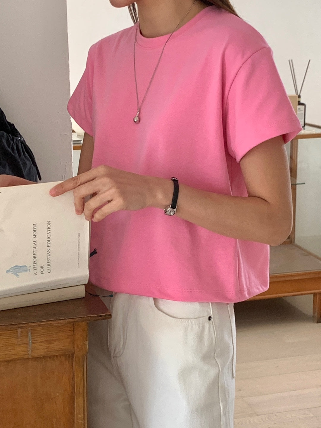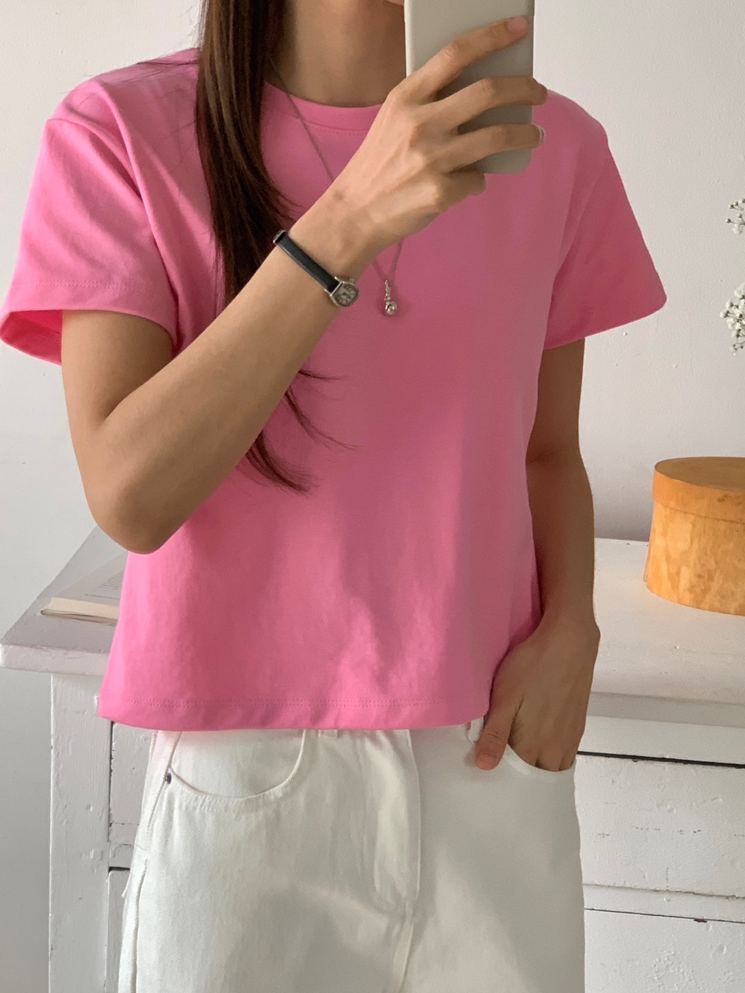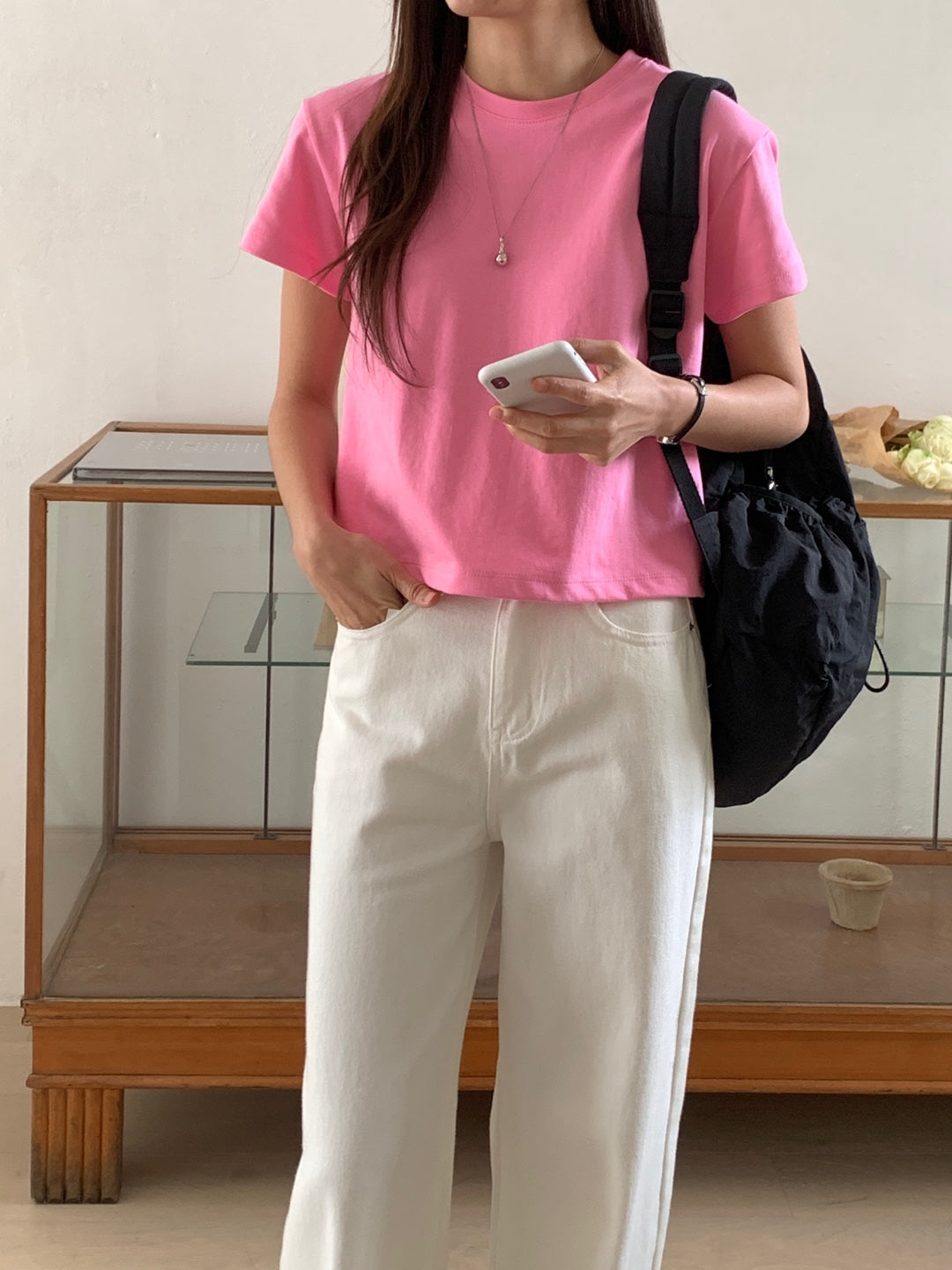With its classic crew neck and short sleeves, the slightly cropped length makes it perfect for pairing with high-waisted jeans, skirts, or relaxed pants.
