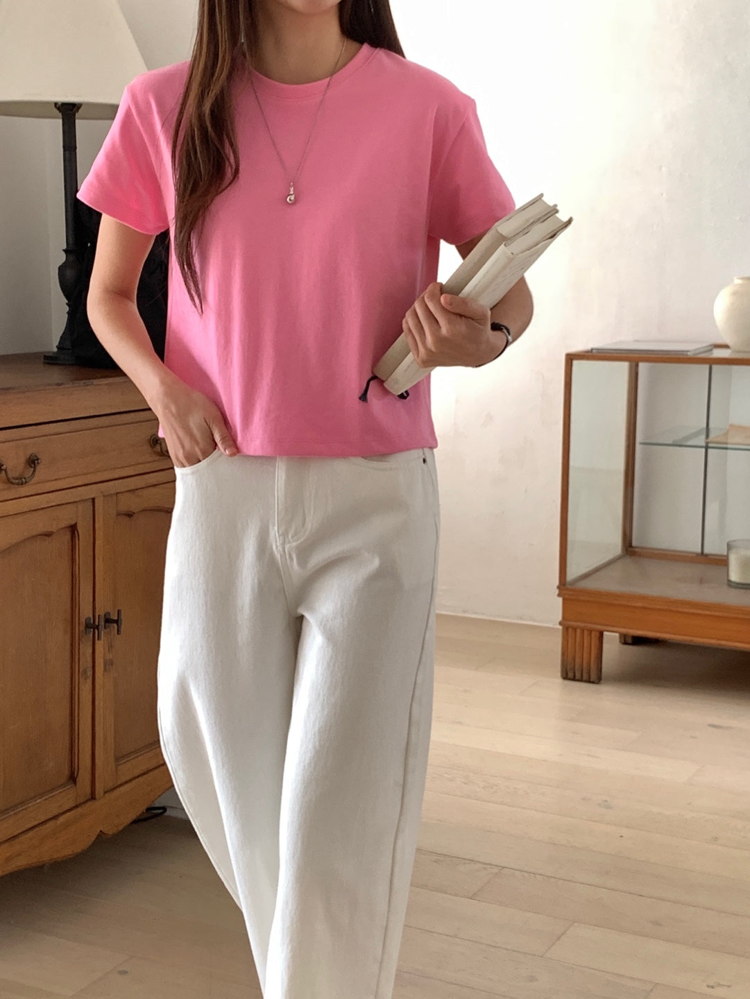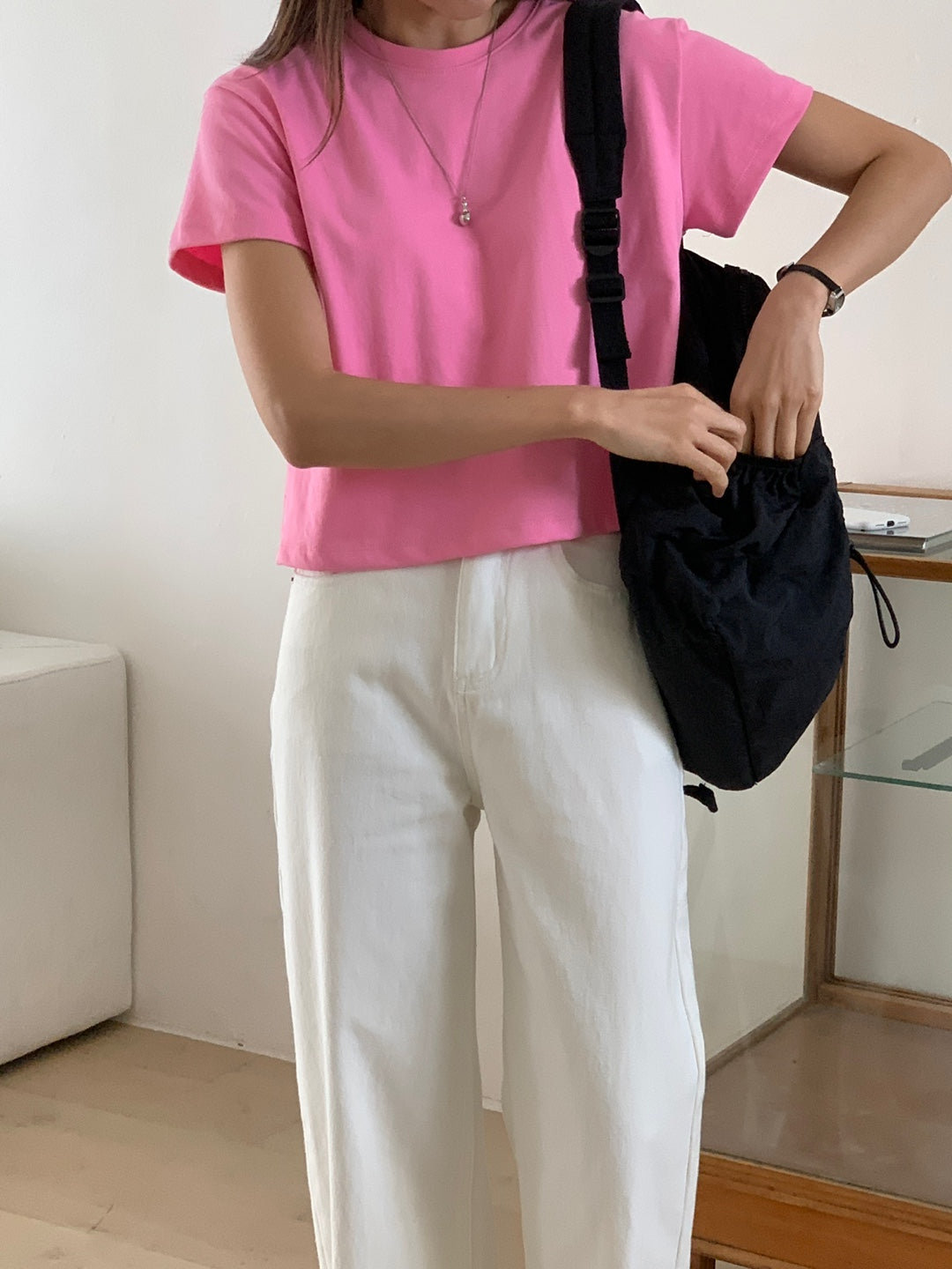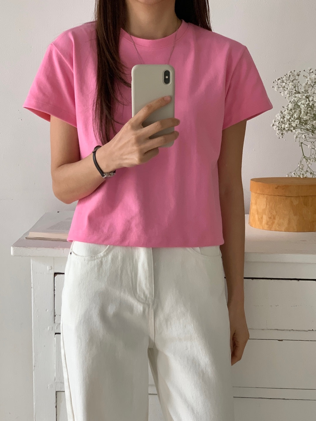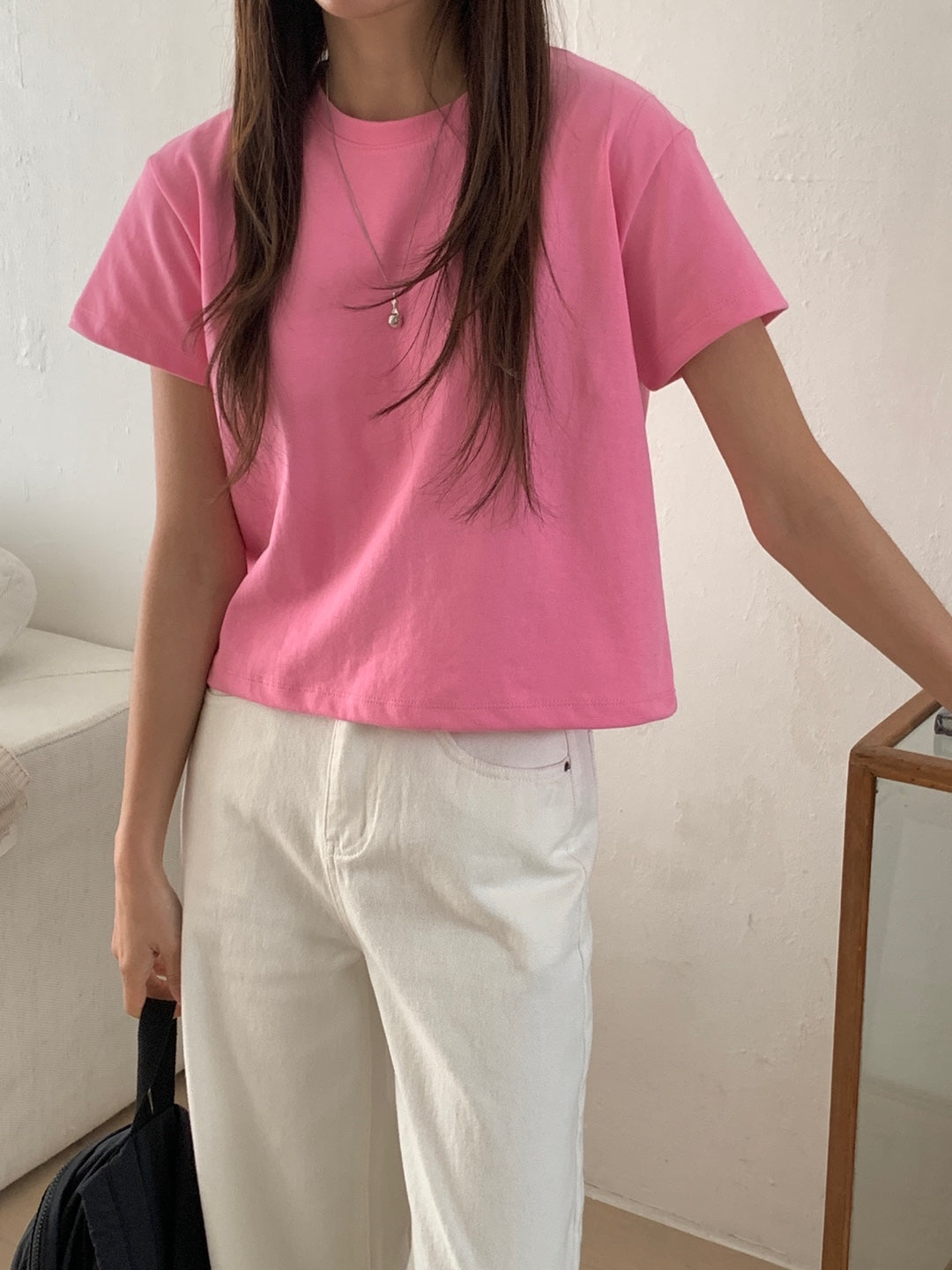 With its classic crew neck and short sleeves, the slightly cropped length makes it perfect for pairing with high-waisted jeans, skirts, or relaxed pants.