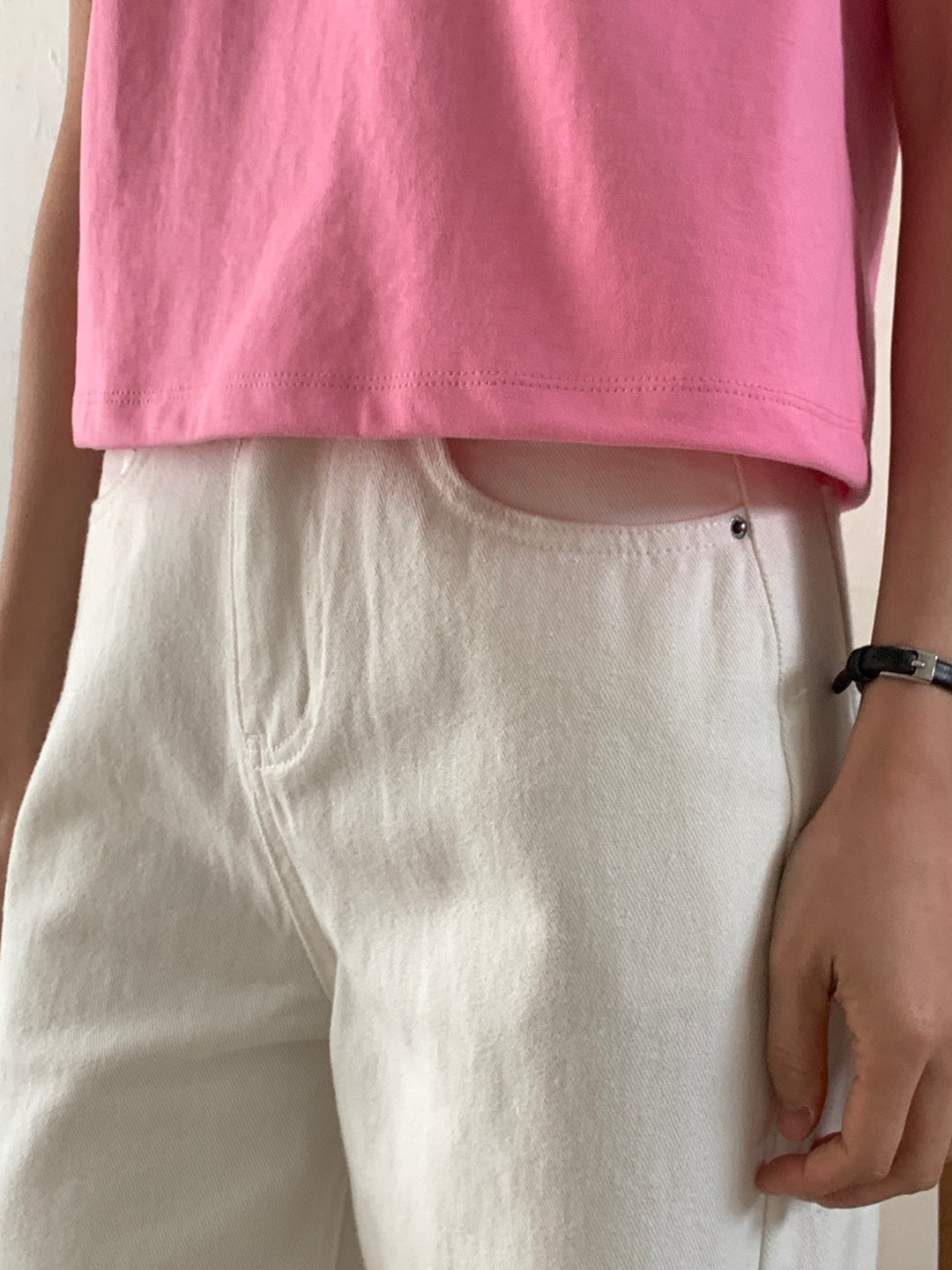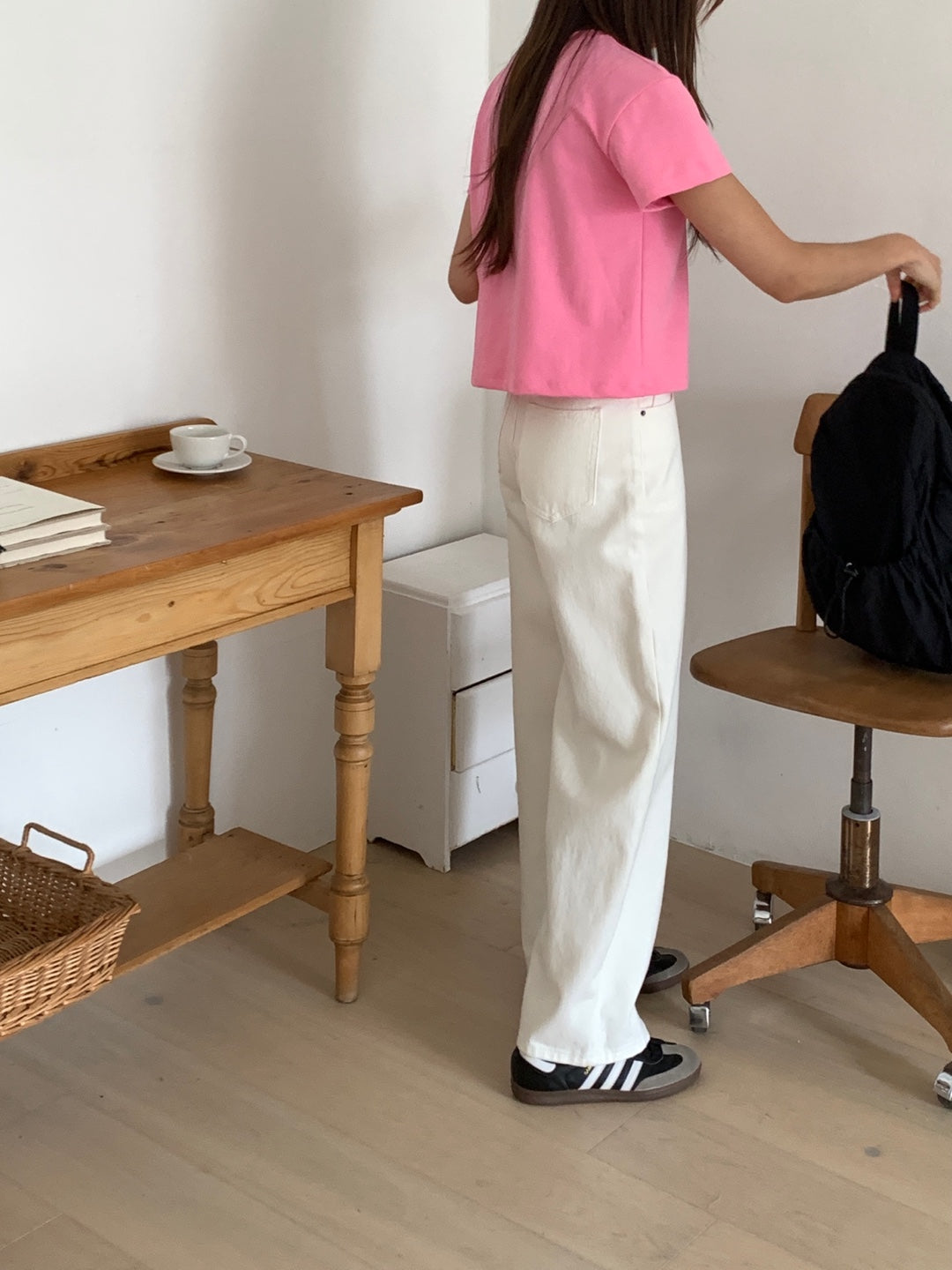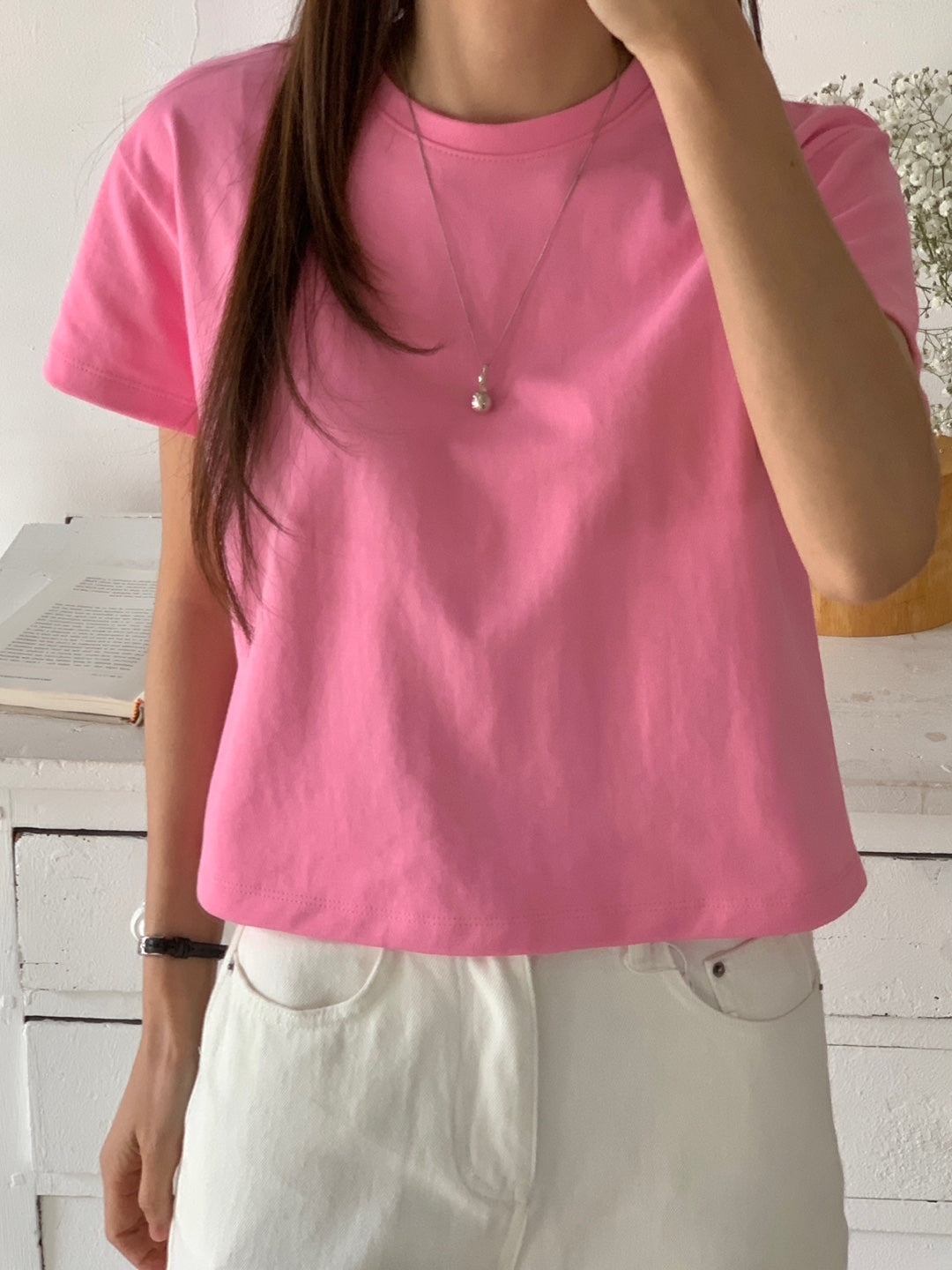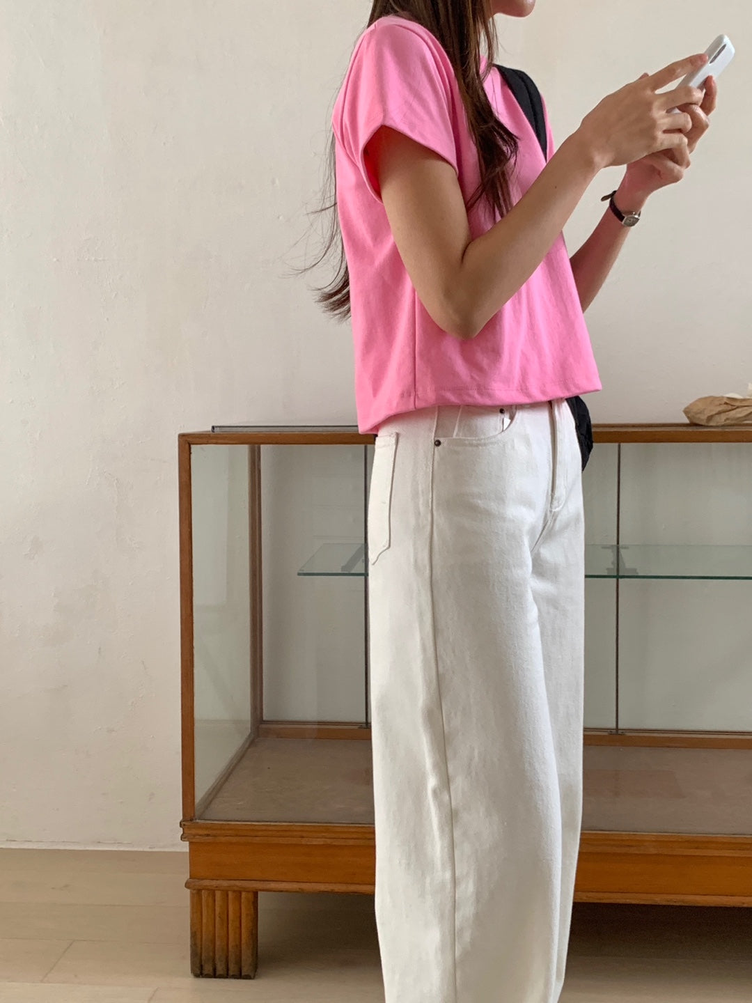 With its classic crew neck and short sleeves, the slightly cropped length makes it perfect for pairing with high-waisted jeans, skirts, or relaxed pants.